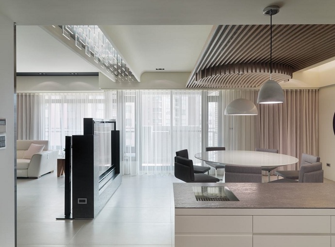 整体空间以现代禅风设计及略带贵气的氛围带出全室设计,在设计的过程里将原本不平整的餐厨空间格局重整,用家具重新配置空间属性,让整体看起来宽敞,并将景观优美的优势放大;开放式的客厅、餐厅、厨房及书房空间,让自然绿意成为最适合的艺术品。