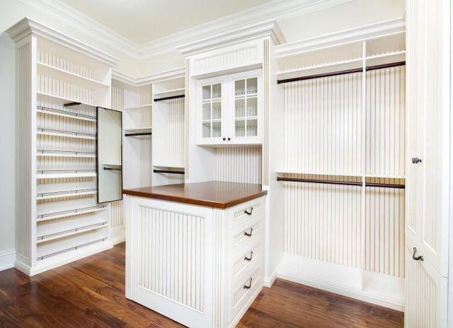 把衣物隔层做高一些,或者直接在天花板上装衣服架子,可以很好地利用上面的空间。既一目了然,又节约空间。隔层最上方可以根据自己的实际选择放一些不常用的东西,如不应季的衣物、鞋子,或者行李箱、被子等。